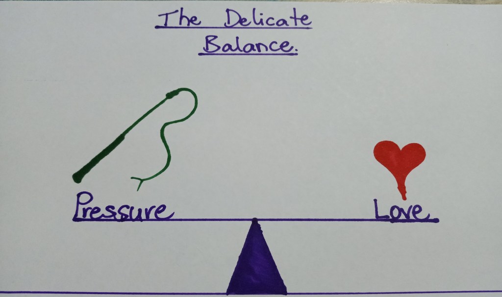 I am a visual learner, so I think of it like this. If the see saw is unbalanced in any way, it creates fear. Love without boundaries (or a little nudge out of the comfort zone), does not create safety and pressure and discipline without love is abuse.